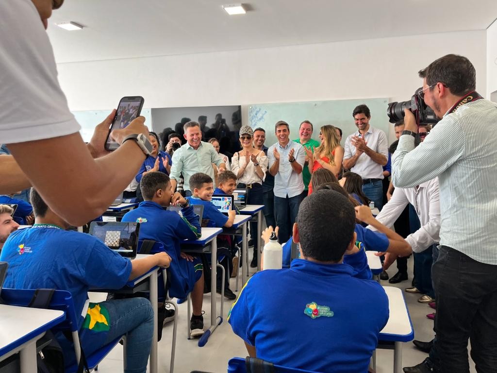 O governador Mauro Mendes, a primeira-dama Virginia Mendes e o secretário de Estado de Educação, Alan Porto, inauguraram, na manhã desta sexta-feira (21.2), em Campo