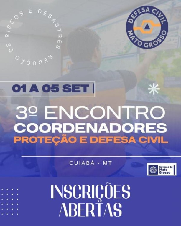 Entre os dias 1º e 5 de setembro, o coordenador de Proteção e Defesa Civil (Compdec), sargento BM da reserva Alberto dos Santos, participará do 3.º Encontro de Coordenadores Municipais de Proteção e Defesa Civil, no Palácio Paiaguás, em Cuiabá.