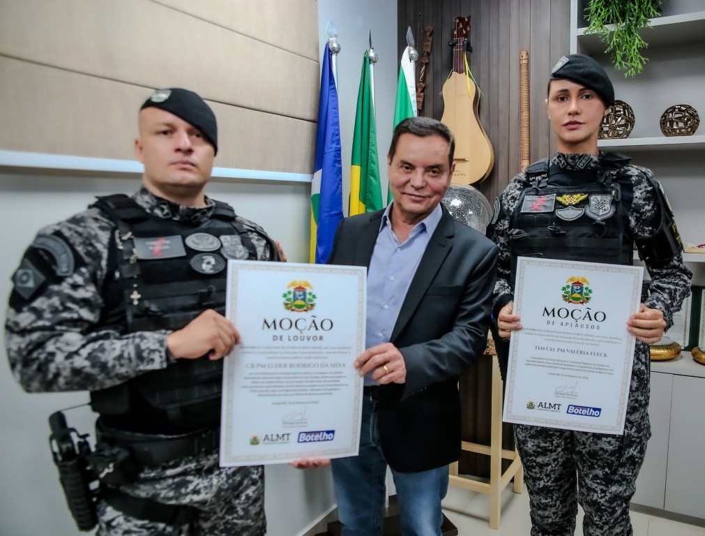 A Assembleia Legislativa de Mato Grosso (ALMT) realizou, nesta segunda-feira (9), a entrega de duas homenagens em reconhecimento ao trabalho de policiais militares que se destacaram na defesa da vida e na segurança da população. De autoria do deputado estadual Eduardo Botelho (União), foram concedidas a Moção de Louvor nº 268/2026 e a Moção de Aplauso nº 267/2026.