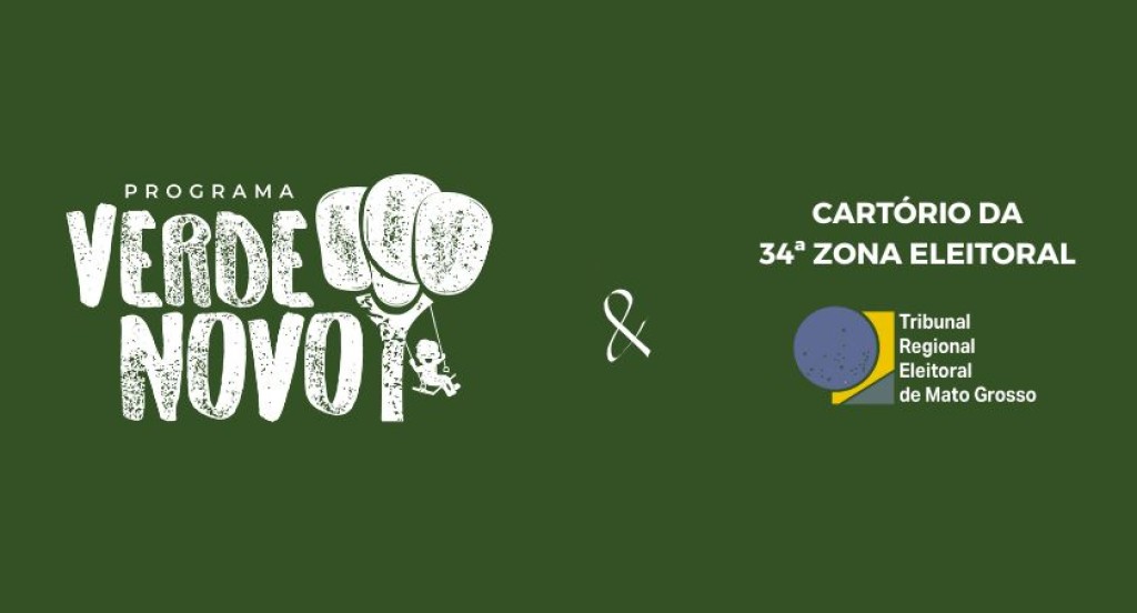 #PraTodosVerem: A imagem mostra um fundo verde com duas marcas em destaque: à esquerda, o logotipo do Programa Verde Novo, representado por balões e uma criança pendurada; à direita, o logotipo do Tribunal Regional Eleitoral de Mato Grosso (TRE-MT), acompanhado da identificação do Cartório da 34ª Zona Eleitoral.