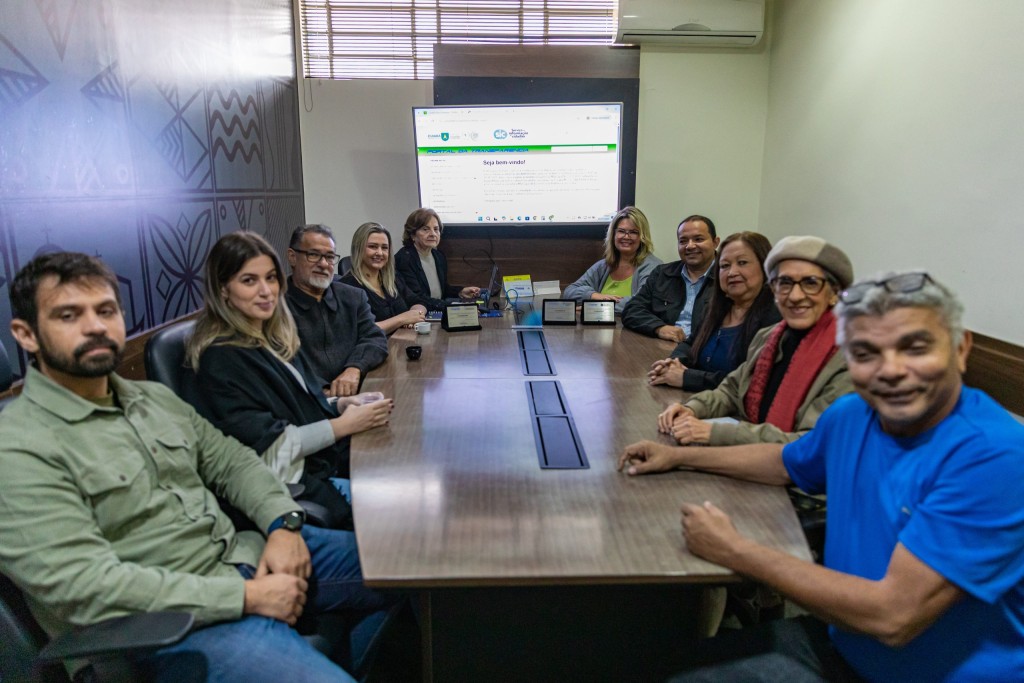 A foto ilustra servidores públicos que compõem a estrutura do Cuiabá-Prev sentados numa sala de reunião. Todos estão apoiados numa mesa de madeira. No fundo, há uma tela de apresentação de um computador.