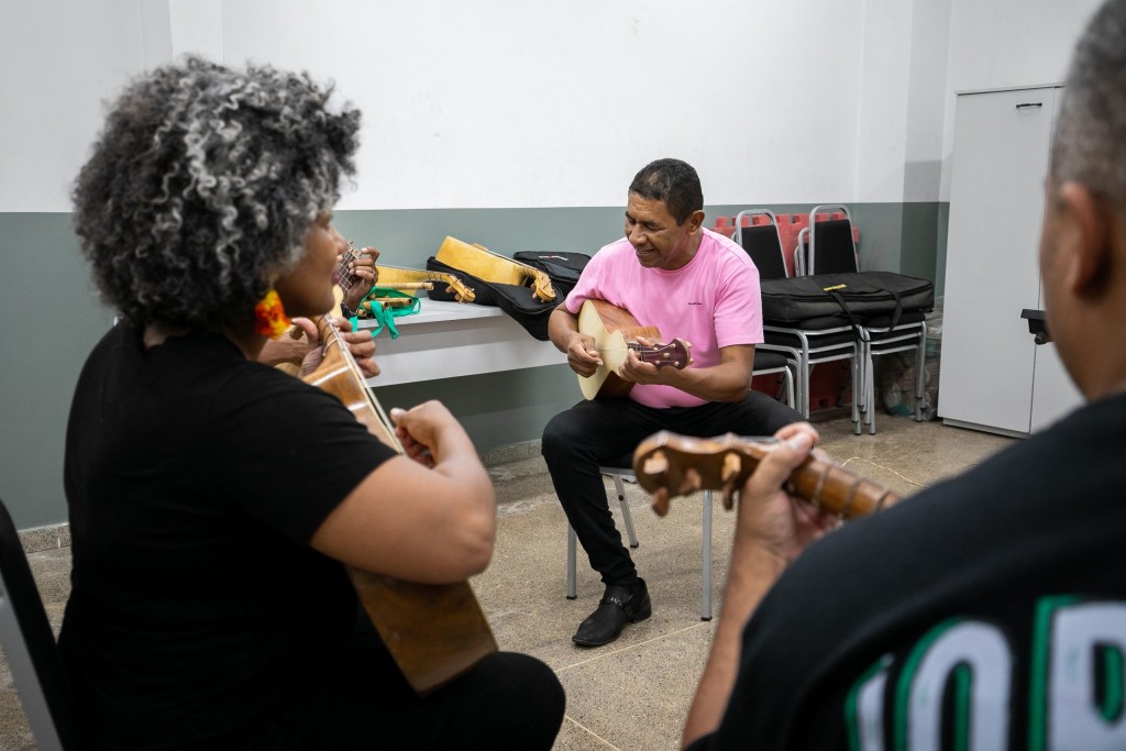 A imagem mostra o momento da aula de viola de cocho, ministrada pelo professor Tomás Flaviano, no Complexo Multiuso Passaredo.