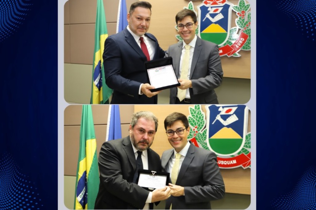 Os desembargadores do Tribunal de Justiça de Mato Grosso Marcos Regenold Fernandes e Wesley Sanches Lacerda, do quinto constitucional do Ministério Público de Mato Grosso (MPMT), empossados em 2024, foram homenageados na reunião ordinária do Colégio de Procuradores na manhã desta quinta-feira (5), pelos relevantes serviços prestados à instituição. O procurador de Justiça aposentado José Basílio Gonçalves também foi agraciado com a homenagem, mas por motivos de saúde não pôde comparecer. A reunião ocorreu presencialmente na sede da Procuradoria-Geral de Justiça e foi transmitida ao vivo pelo canal do MPMT no YouTube (assista aqui).