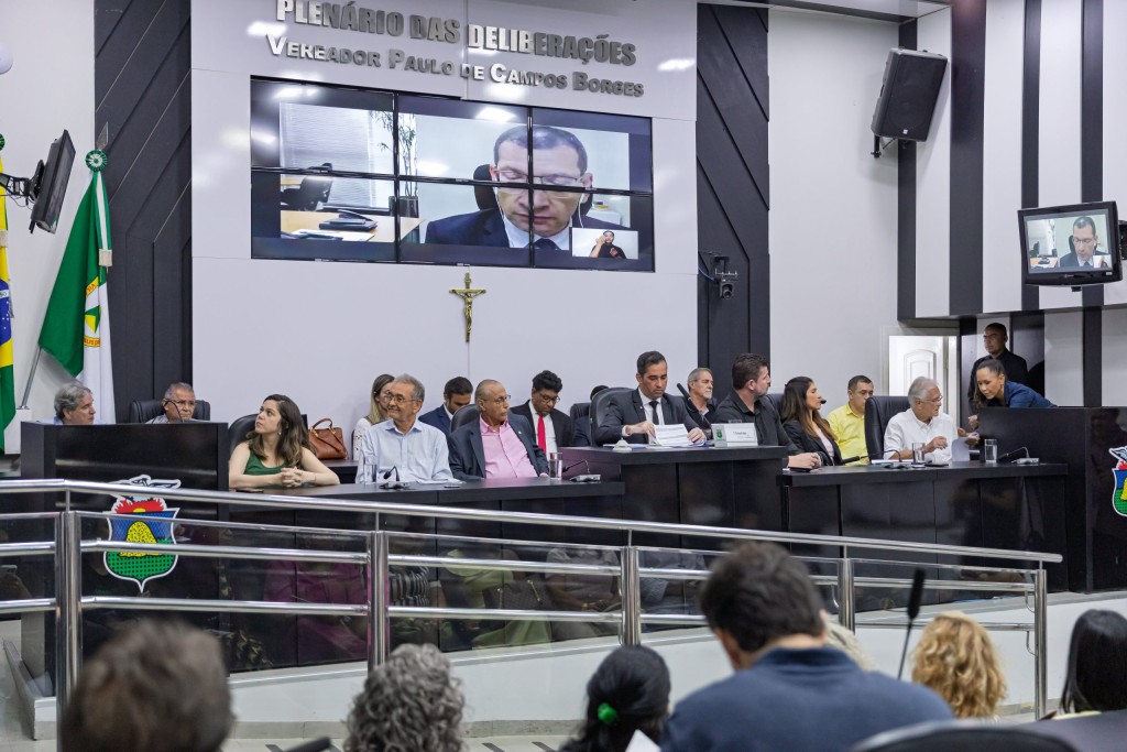 A foto mostra o plenário e autoridades na Câmara de Vereadores durante a audiência pública.