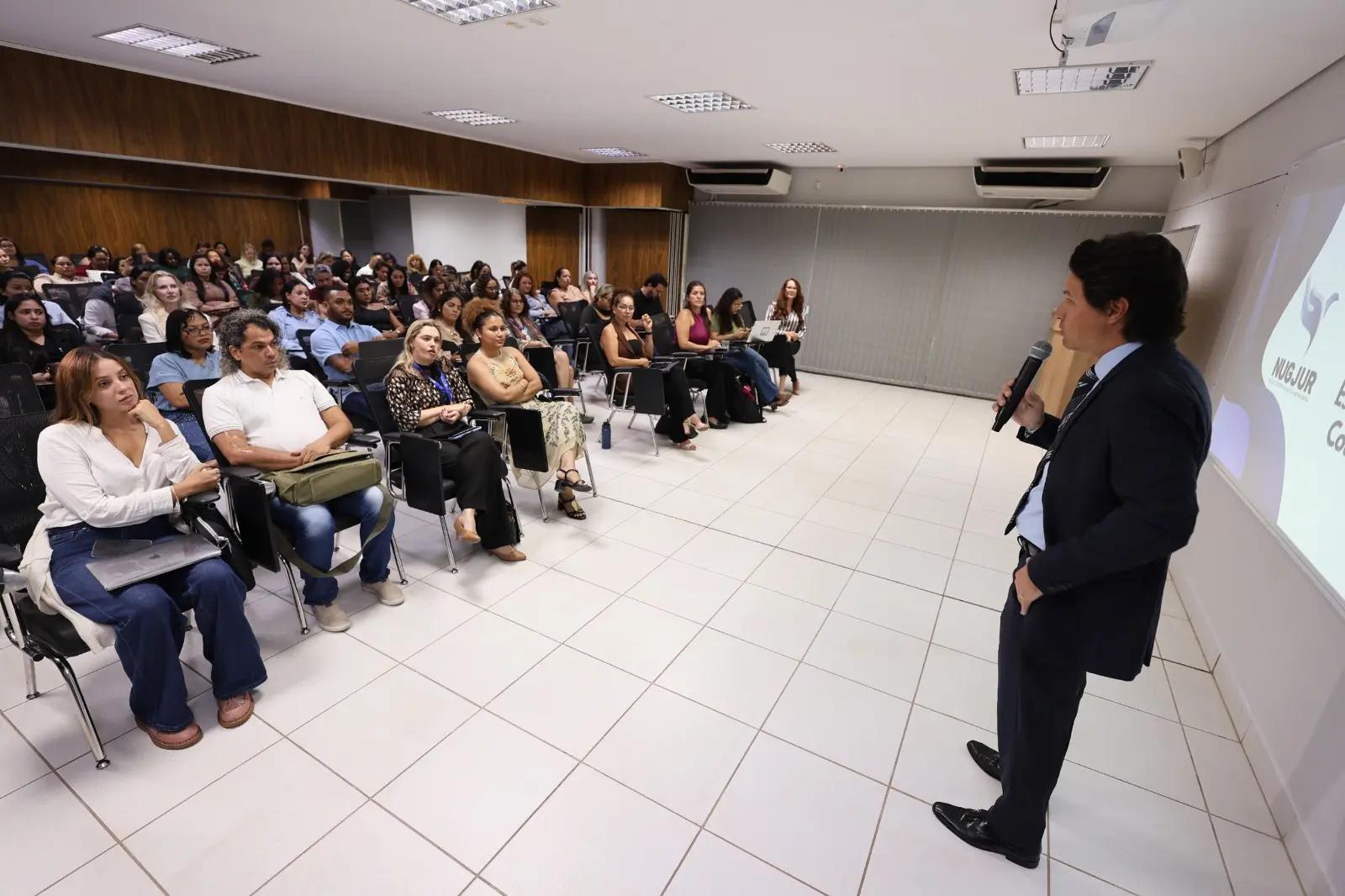 #Paratodosverem. Esta matéria possui recursos de texto alternativo para promover a inclusão das pessoas com deficiência visual. Foto 01: Imagem horizontal colorida do público que participou da aula magna na Escola dos Servidores do Poder Judiciário. À frente, o coordenador adjunto do Núcleo Gestor da Justiça Restaurativa, juiz Luís Otávio Pereira Marques dás as boas-vindas aos participantes. Ele veste terno escuro está posicionado no centro da sala e segura um microfone enquanto fala com o público. Foto 02: O juiz Luís Otávio Pereira Marques concede entrevista à TV Jus. Foto 03: A líder do Núcleo de Mediação Escolar da Secretaria de Estado de Educação, Patrícia Carvalho, ela tem cabelos longos ondulados em tom castanho-avermelhado, usa óculos de armação estampada e blusa listrada em azul, branco e marrom. Foto 04: A psicóloga da Secretaria de Educação, Júlia Gabrielli Moraes, ela usa o cabelo preso em coque alto cacheado, e vestido em tom bege com estampa floral. Foto 05: O instrutor do Núcleo de Justiça Restaurativa, Rauny Viana, ele veste camisa clara e calça azul e fala em pé diante de uma turma sentada.