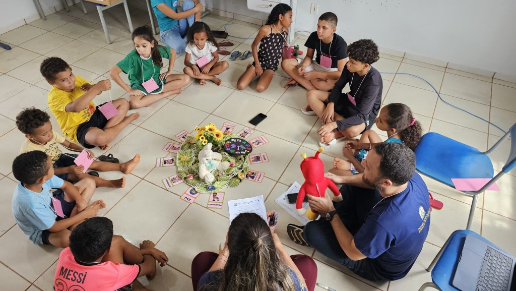 #Paratodosverem. Esta matéria possui recursos de texto alternativo para promover a inclusão das pessoas com deficiência visual. Descrição de imagem. Foto 1: Crianças sentadas ao chão em formato circular para participação do círculo de construção de paz. São 10 crianças e dois facilitares que estão sentados ao chão. No centro, há tarjetas/cards com valores e sentimentos inerentes ao ser humano, brinquedos, girassois e outros objetos que fazem parte da dinâmica restaurativa.