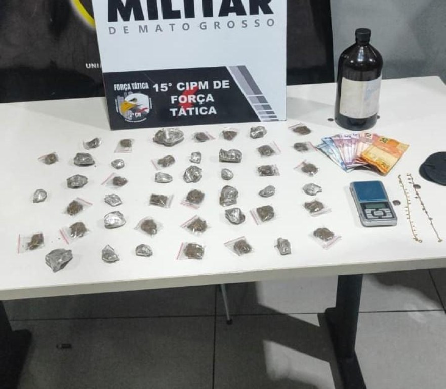 Em determinado momento, os militares flagraram um casal em uma moto em que o condutor apresentava as mesmas características informadas. Durante a abordagem, o condutor foi identificado e com ele encontradas duas porções de maconha e seis porções de pasta base de cocaína.