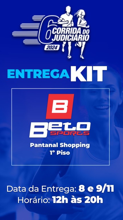 ParaTodosVerem – Esta matéria possui recursos de texto alternativo para promover a inclusão das pessoas com deficiência visual. A imagem é um cartaz promocional da “6ª Corrida do Judiciário 2024”. Na parte superior, há um logotipo com duas figuras correndo, uma masculina e outra feminina, com o nome do evento “6ª Corrida do Judiciário 2024” escrito ao lado delas. Abaixo do logotipo, o texto “ENTREGA KIT” é exibido em destaque. Mais abaixo, há uma caixa contendo o logotipo e o nome de “Beto Sports”, juntamente com o local “Pantanal Shopping 1º Piso”. Na parte inferior do cartaz, são fornecidas as datas e horários de entrega: “Data da Entrega: 8 e 9/11” e “Horário: 12h às 20h”.