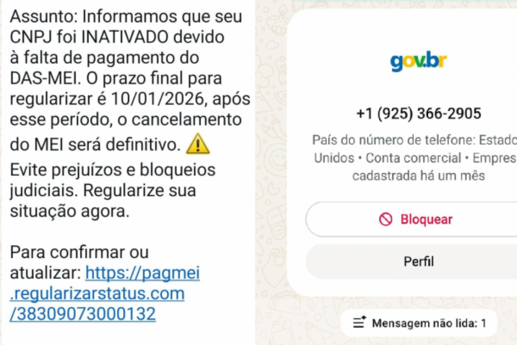 O início do ano, período tradicional de organização financeira e regularização de atividades, tem sido aproveitado por golpistas para enganar microempreendedores individuais (MEIs). Mensagens enviadas via WhatsApp, a partir de um perfil falso com imagem e identidade visual semelhantes ao gov.br, informam que o CNPJ do empresário estaria suspenso e direcionam a um link de pagamento para suposta regularização. Trata-se de golpe.