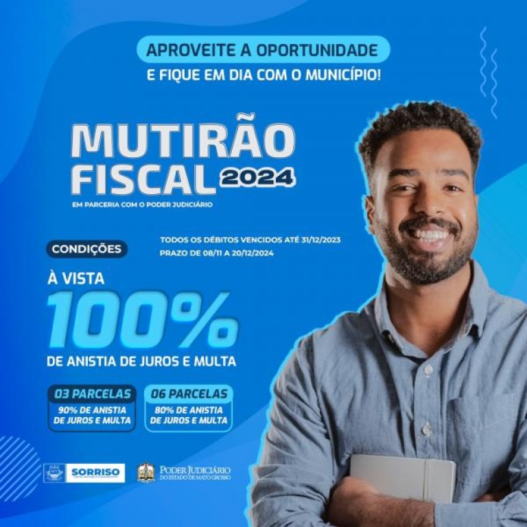 Para facilitar a renegociação das dívidas, o requerimento para adesão ao Mutirão pode ser feito pelo site da Prefeitura (site.sorriso.mt.gov.br). Aí, é só escolher a melhor forma de pagamento no link https://prefsorriso-mt.agilicloud.com.br/portal/sorriso/#/refis e só vir até o Departamento de Tributação, das 7h às 12h, para homologar o acordo. Todo o processo pode também ser feito pelo WhatsApp da Tributação, o 3545 4707.
