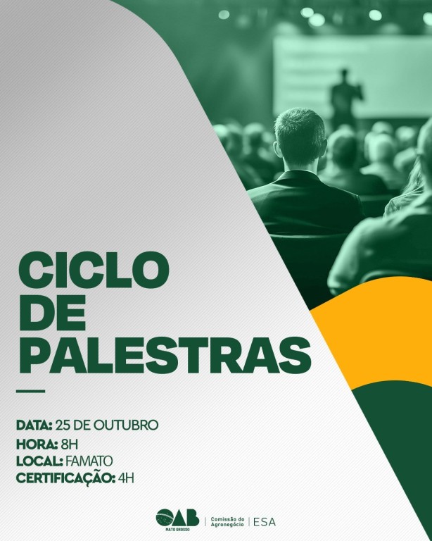 Descrição da imagem: peça publicitária colorida e vertical. À direita, imagem de auditório com pessoas sentadas olhando para alguém em pé escrevendo no quadro. À esquerda, texto: Ciclo de Palestras. Data: 25 de outubro. Horas: 8h. Local: Famato. Certificação: 4h.