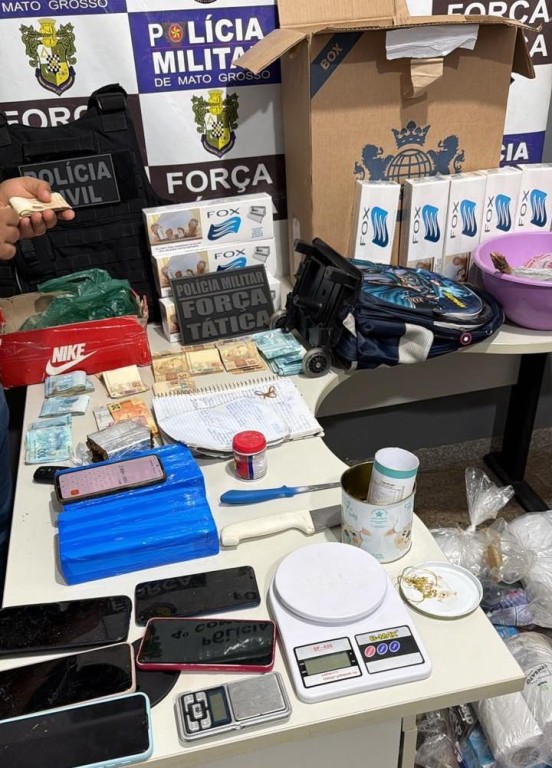 Ainda no local, os policiais encontraram 12 cestas básicas e oito complementos no quarto das crianças, três cestas básicas no veículo do conduzido, destinadas a entregas em nome de facção criminosa, uma sacola com duas facas de diferentes tamanhos, embalagens usadas para o tráfico doméstico e diversos aparelhos celulares espalhados pela residência, utilizados na venda de drogas.