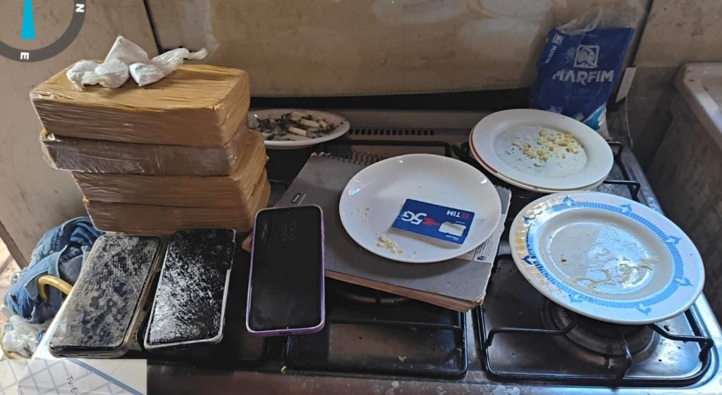 Dentro da casa, a equipe encontrou e apreendeu quatro tabletes de pasta base de cocaína, com 1kg cada um, e quatro sacos plásticos com cocaína. Também foram apreendidos três celulares, sendo que dois deles estavam danificados, possivelmente pelos próprios suspeitos, ao perceberem a presença policial.