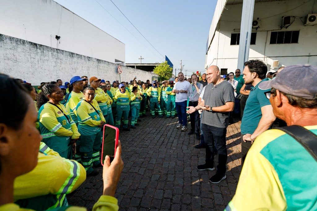 A imagem mostra o prefeito Abilio Brunini em diálogo com os colaboradores da Empresa Cuiabana de Zeladoria e Serviços Urbanos – Limpurb.