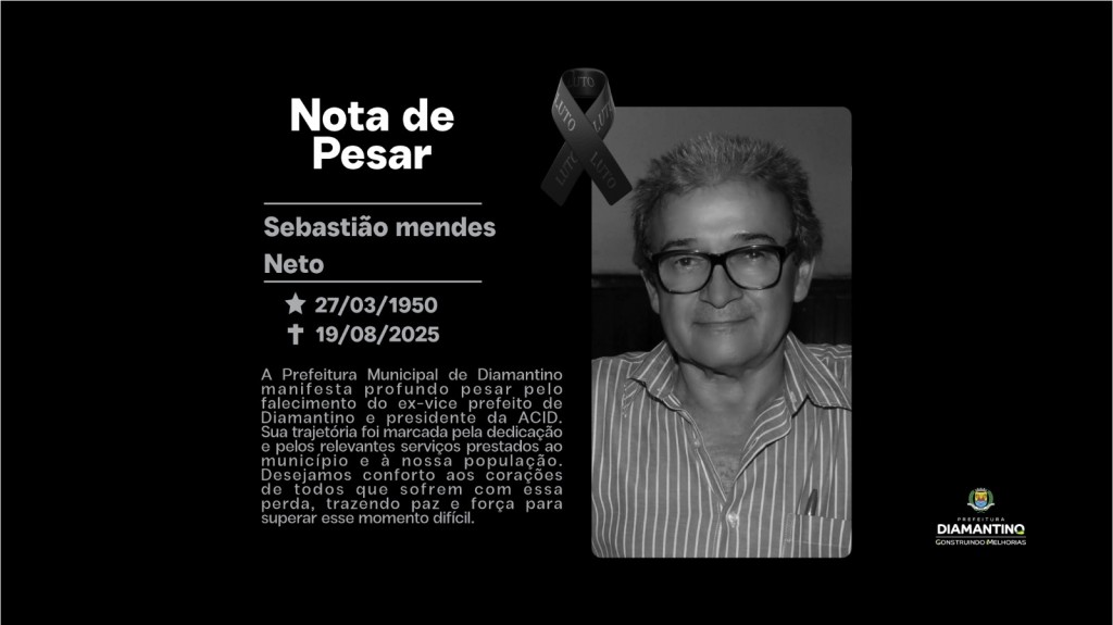 É com profundo pesar que a Administração Municipal de Diamantino comunica o falecimento de Sebastião Mendes Neto (Tiãozinho da Guimatra), empresário, homem público e de fé, que dedicou sua vida à família, ao trabalho e ao bem comum. Atuou como presidente da Associação Comercial e Empresarial de Diamantino (ACID), foi vice-prefeito de Diamantino no mandato de 2009 a 2012, além de exercer papel importante como líder comunitário e religioso.