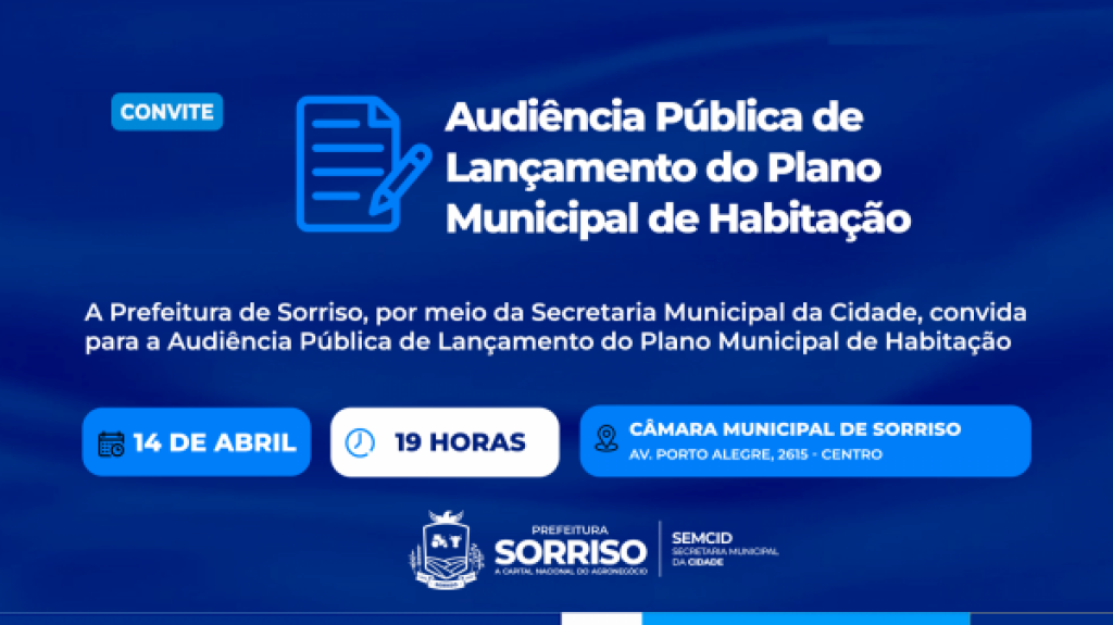 A Prefeitura de Sorriso realizará amanhã (14), às 19h, no plenário da Câmara de Vereadores, a audiência pública de lançamento do Plano Municipal de Habitação. O encontro é aberto à população, lideranças comunitárias, representantes de entidades e autoridades municipais.