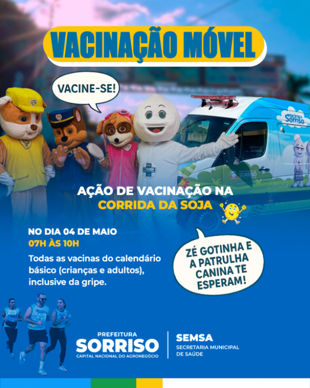 Com o objetivo de aumentar a cobertura vacinal no Município e sensibilizar a sociedade acerca dos benefícios de seguir o esquema de imunização recomendado. A Secretaria de Saúde, em parceria com a Secretaria de Esporte, Lazer e Juventude, realizará no dia 04 de maio, durante a Corrida da Soja, uma ação de atualização da carteira vacinal. A iniciativa visa facilitar o acesso da população à imunização, garantindo a segurança e proteção contra diversas doenças.