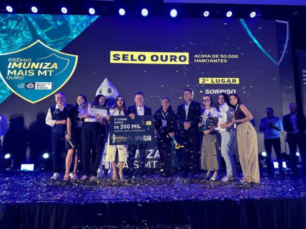 Sorriso recebeu ontem, 04 de março, a premiação do 2.º lugar no Selo Ouro para municípios acima de 50 mil habitantes do Programa Imuniza Mais MT, promovido pela Secretaria de Estado de Saúde (SES-MT) desde 2021. Com a colocação o Município recebeu R$ 350 mil, valor que deve ser aplicado em novas ações de vacinação.