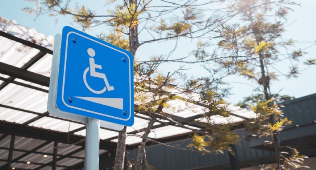 PraTodosVerem: A imagem mostra uma placa azul com o símbolo internacional de acessibilidade, representado por uma pessoa em cadeira de rodas, acompanhada de um ícone indicando a presença de rampa. Ao fundo, vê-se parte de uma estrutura coberta e árvores sob céu claro, sugerindo um ambiente externo e ensolarado.