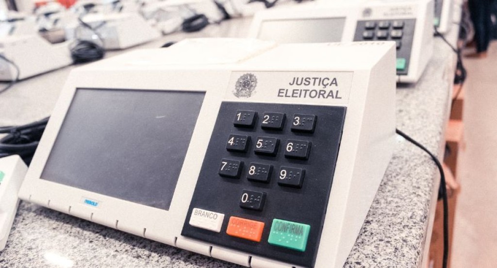 #PraTodosVerem: A imagem mostra uma urna eletrônica da Justiça Eleitoral posicionada sobre uma mesa. O equipamento exibe o teclado numérico com botões coloridos — branco, corrige e confirma — em destaque, e ao fundo é possível ver outras urnas alinhadas.