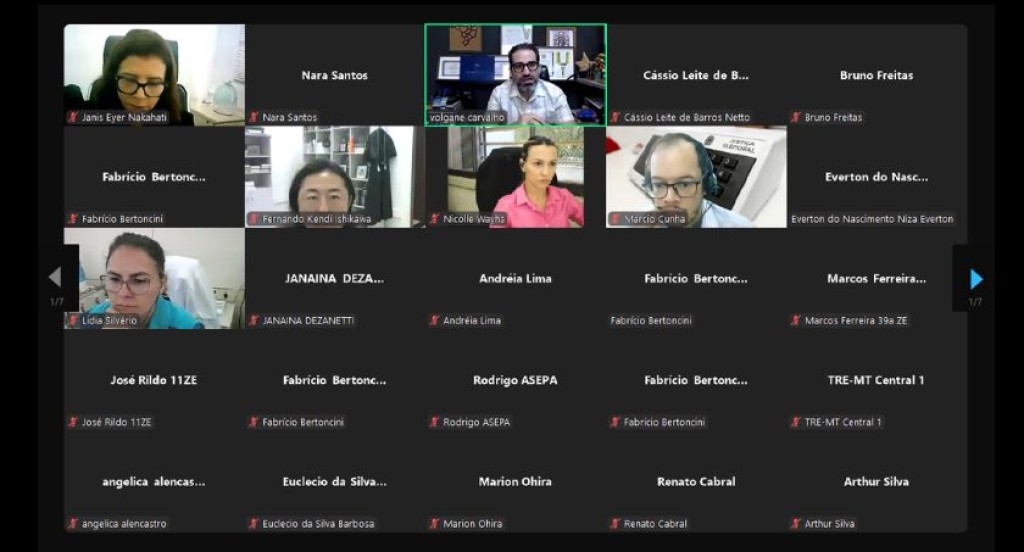 #PraTodosVerem: A imagem mostra uma captura de tela de uma reunião virtual, realizada por videoconferência, com diversos participantes, incluindo magistrados, servidores e palestrantes. No destaque estão os participantes com vídeo ativado, entre eles o professor Volgane Carvalho, que aparece ministrando a aula. A reunião é parte do curso “Julgamentos Eleitorais com foco nas Perspectivas de Gênero e Étnico-racial”, promovido pela Escola Judiciária Eleitoral do TRE-MT. A tela apresenta os nomes dos participantes, a maioria com os microfones silenciados.