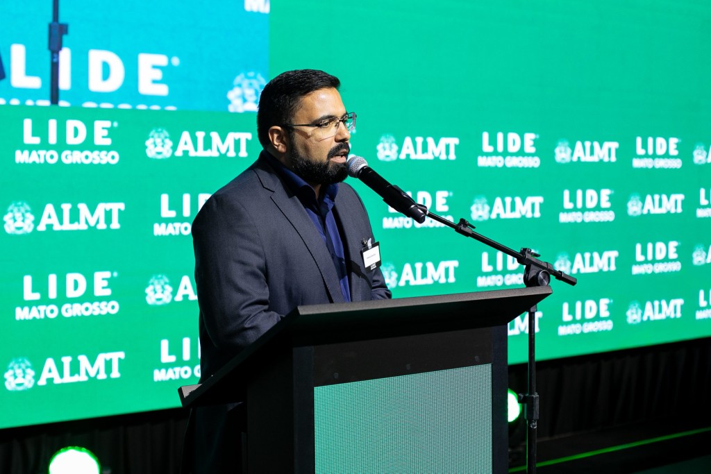 O secretário municipal de Turismo e Desenvolvimento Econômico, Fernando Medeiros, discursa durante o Fórum de Sustentabilidade e Desenvolvimento Econômico, promovido pelo LIDE Mato Grosso, em Cuiabá. Ao fundo, painel com a identidade visual do evento e da Assembleia Legislativa (ALMT)..