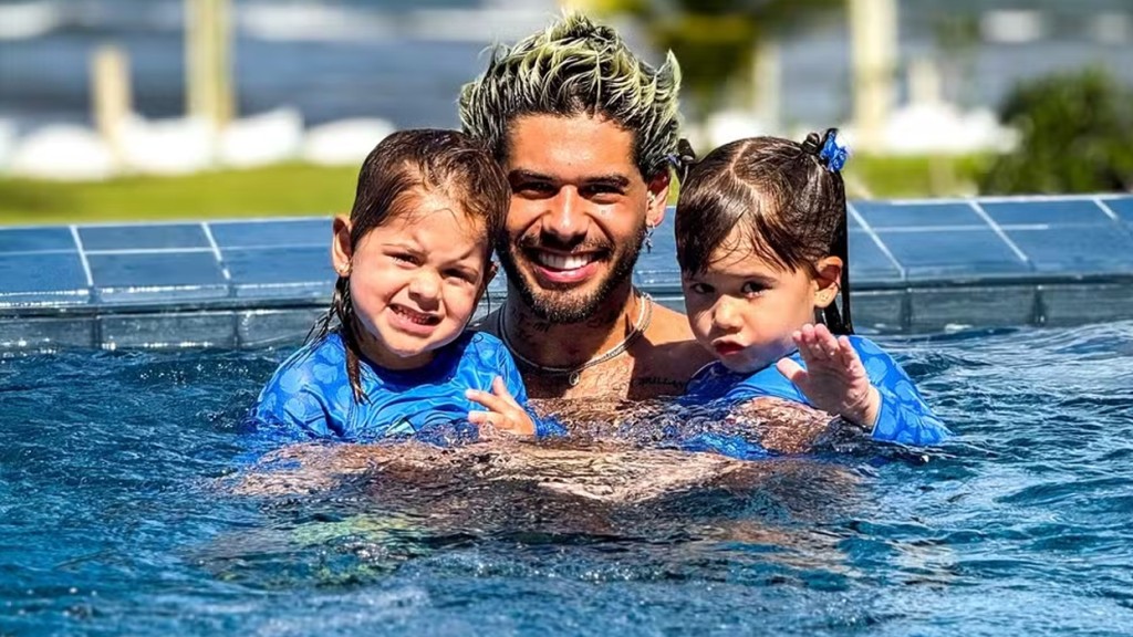 Zé Felipe, de 27 anos, encantou os seguidores ao compartilhar cliques ao lado dos filhos nesta terça-feira (1). Nos cliques publicados nas redes sociais, o cantor aparece curtindo na piscina com Maria Alice, de 4 anos, Maria Flor, de 2, e José Leonardo Fonseca, de 9 meses, frutos do antigo casamento com a influenciadora Virginia Fonseca.